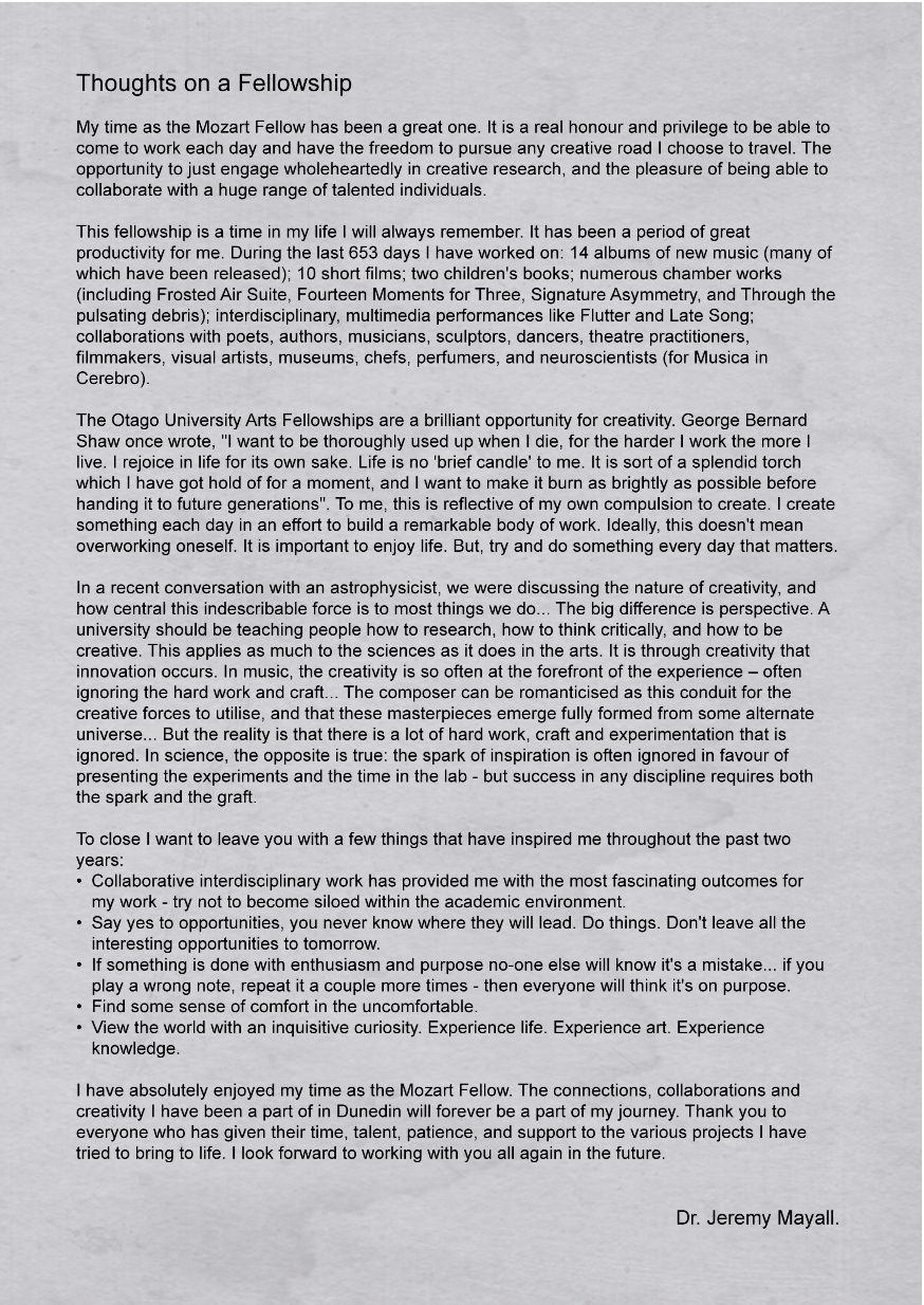 My time as Mozart Fellow at Otago University is now officially over. It has been a hugely productive and enjoyable time. An absolute pleasure to spend those two years in Dunedin, working with the brilliant people and expending my own experiences as a composer and collaborative researcher.