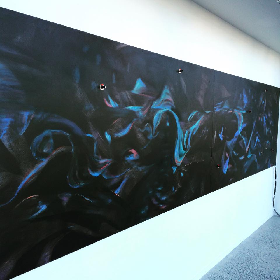 “This work started as sound, then became image, then became image with sound. It is a true collaboration that was developed through reactions and conversations. The physical link with the painting encourages the viewer to engage with the smaller details of the work, getting up close with the painting, anchored by the headphones. The links between the sound and image can be explored in further details creating an immersive experience. An experience that is also unlike other paintings in gallery where this time the viewer can have a physical connection to the work through touch.”